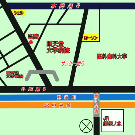 JR御茶ノ水駅 御茶ノ水橋口より 東京医科歯科大方面横断歩道を渡り左折。順天堂大学病院方面。 順天堂前信号右折。順天堂病院連絡橋をくぐる。 順天堂横信号こす。薬局。 一階、爬虫類ショップ。二階、レプタイルクリニックのビル三階。